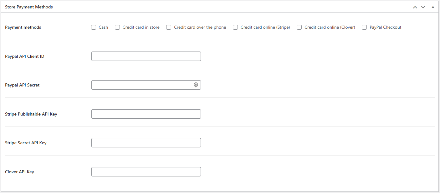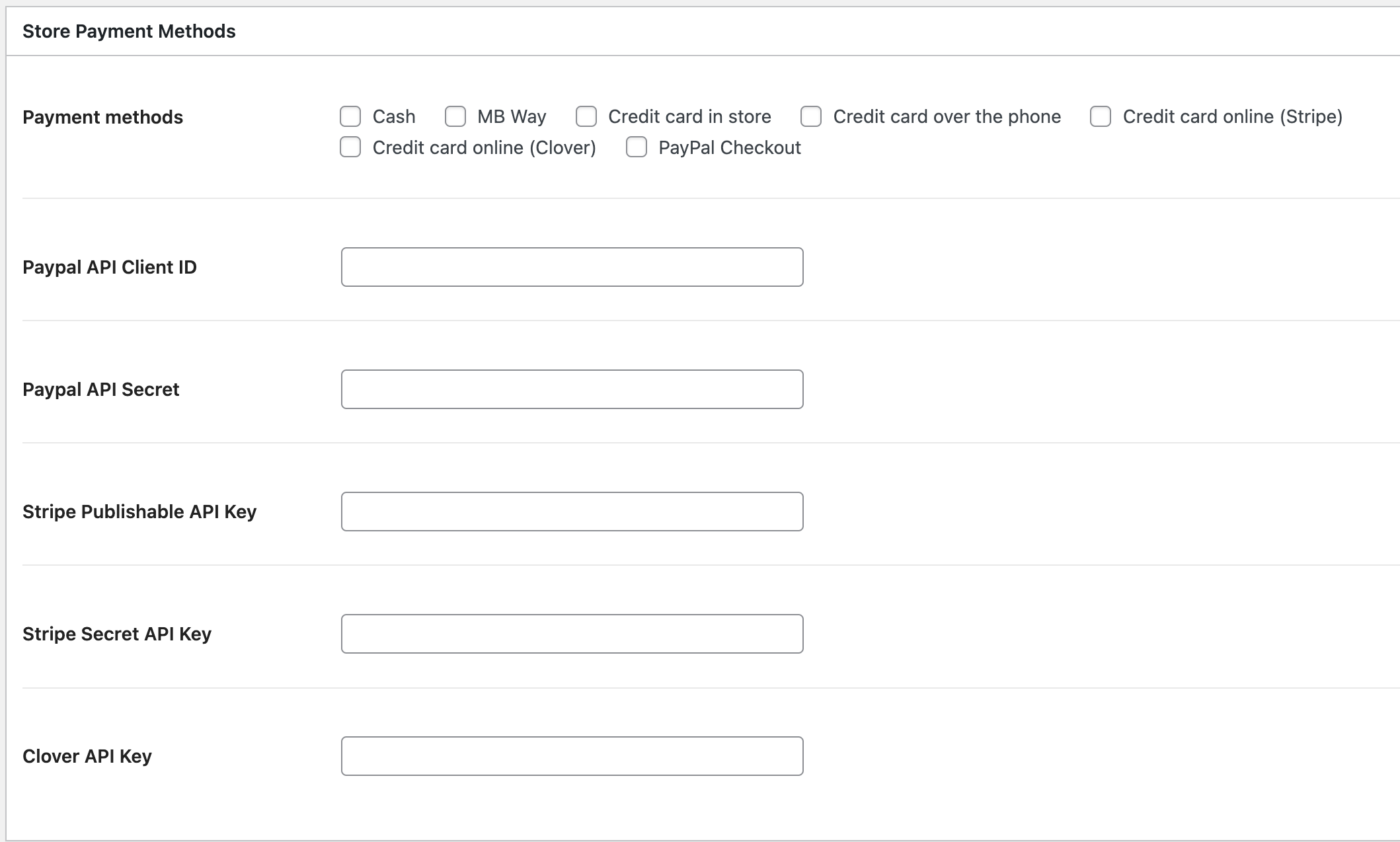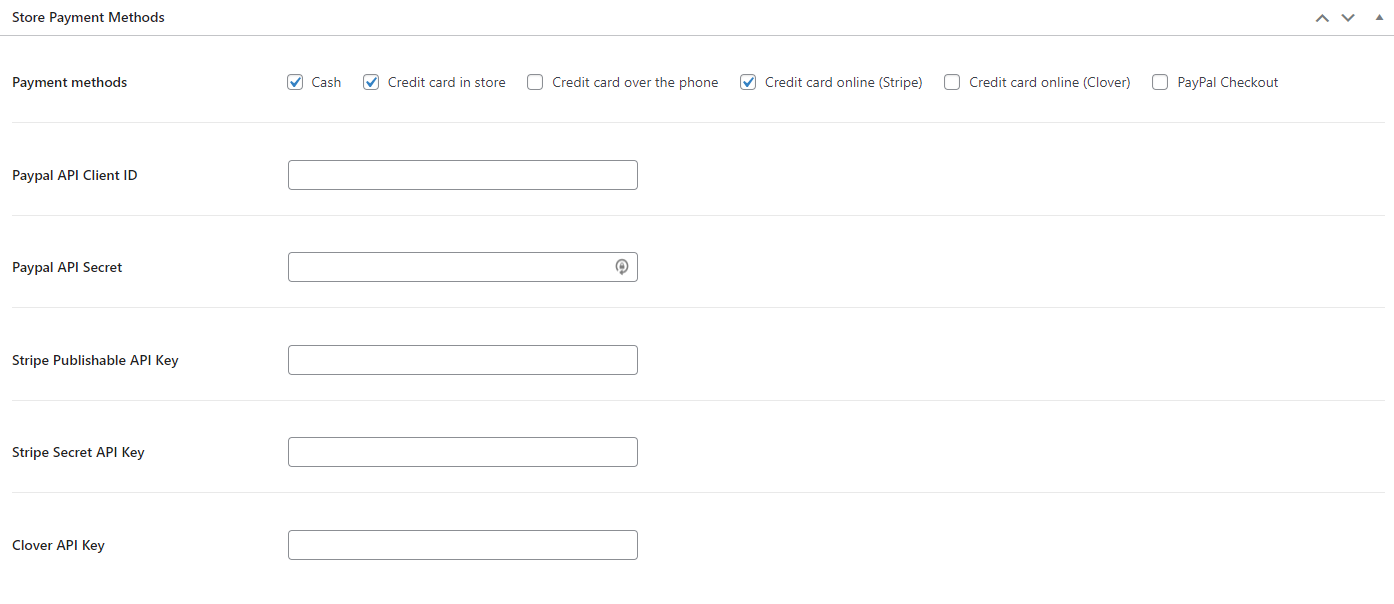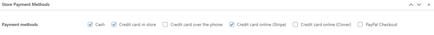 Nella sezione Store Payment Methods è possibile stabilire quali metodi di pagamento attivare selezionando le checkbox corrispondenti. Per attivare correttamente PayPal, Stripe o Clover, occorre seguire i passaggi successivi.
