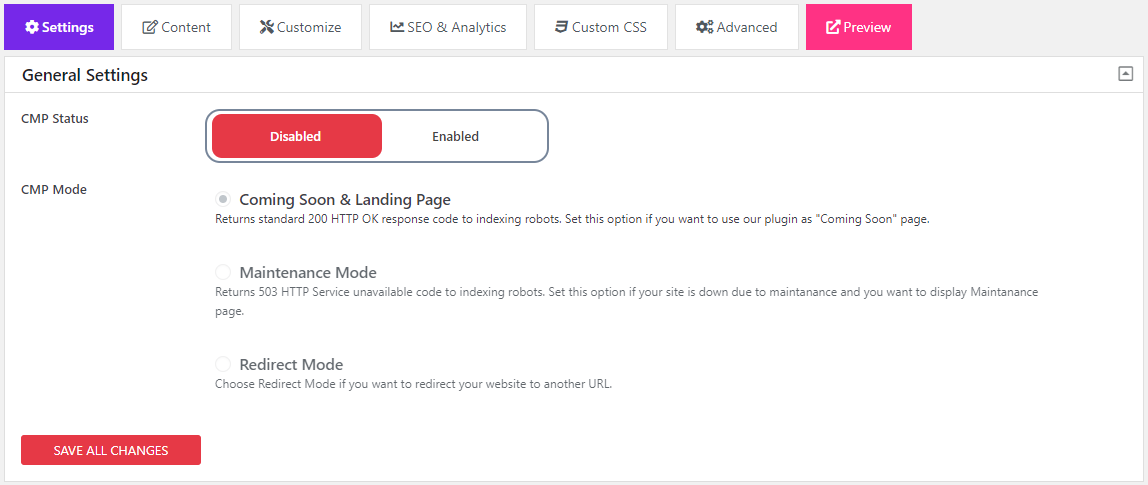 Per disattivare la modalità coming soon e rendere di nuovo tutto visibile, basterà riportare il pulsante del CMP Status su Disabled.