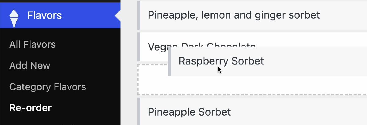 Il plugin consente di riordinare gli elementi presenti sia tra i Products che tra i Flavors. Basterà selezionare la voce Flavors o Products dal backend del sito e poi cliccare su Re-Order. Comparirà una lista con tutti i flavors o products già creati che, per riordinare, bisognerà trascinare con il mouse nella posizione desiderata.
