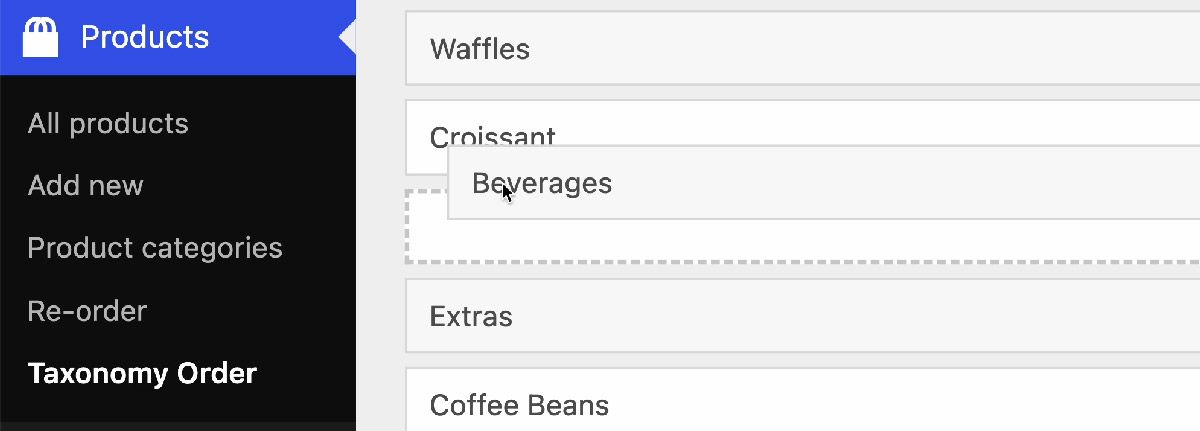 Il plugin consente di riordinare le categorie create sia per i Products che per i Flavors. Basterà selezionare la voce Flavors o Products dal backend del sito e poi cliccare su Re-Order. Comparirà una lista con tutti i flavors o products già creati che, per riordinare, bisognerà trascinare con il mouse nella posizione desiderata.