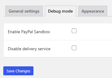 La modalità di debug consente di testare le funzionalità del plugin fino al checkout. Per testare il processo di acquisto con metodo di pagamento PayPal bisogna cliccare la tab Debug mode e selezionare la checkbox Enable PayPal Sandbox.