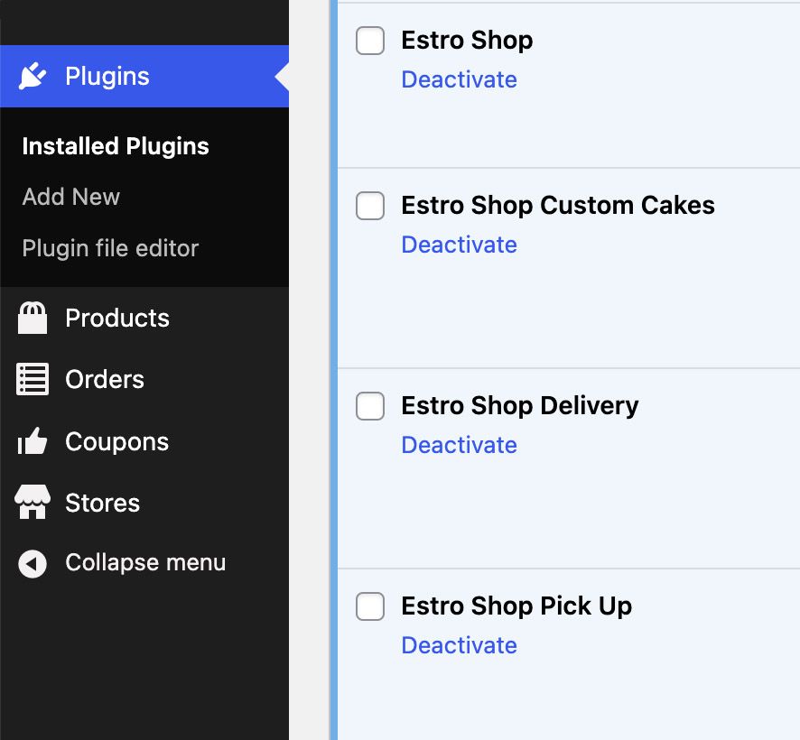 Dal backend del sito, cliccare su Plugins nel menu di sinistra. Verificare che Estro Shop, Estro Shop Custom Cake, Estro Shop Delivery ed Estro Shop Pick Up compaiano nella lista di plugin.